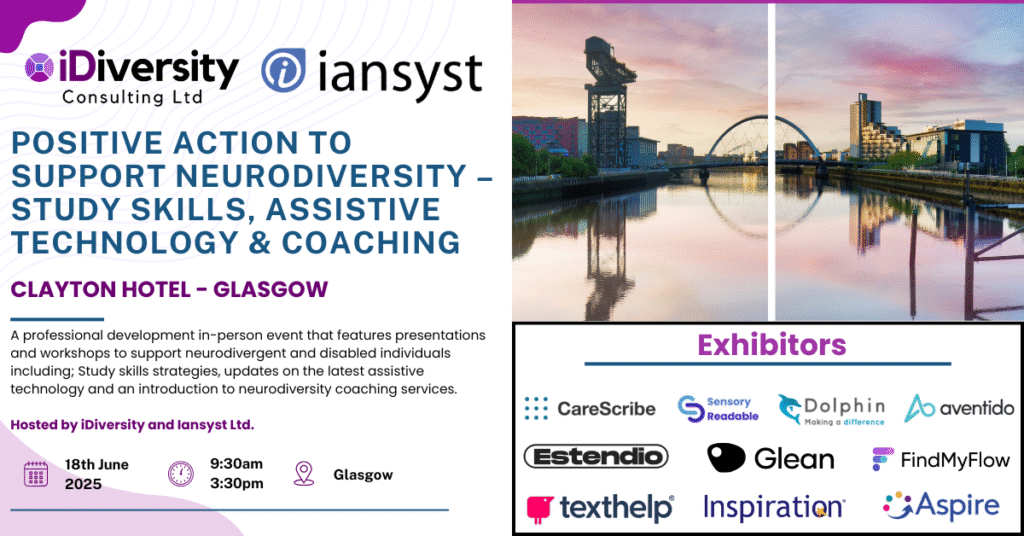 Positive Action to Support Neurodiversity – Study Skills, Assistive Technology & Coaching – 18th June 2025 9:30am – 3:30pm – Clayton Hotel Glasgow